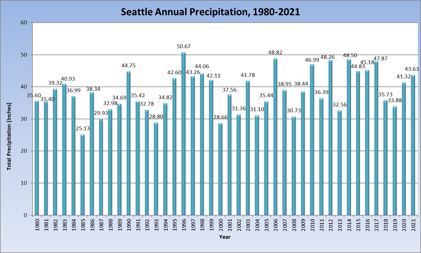 Seattle rain by year, 1980-2020